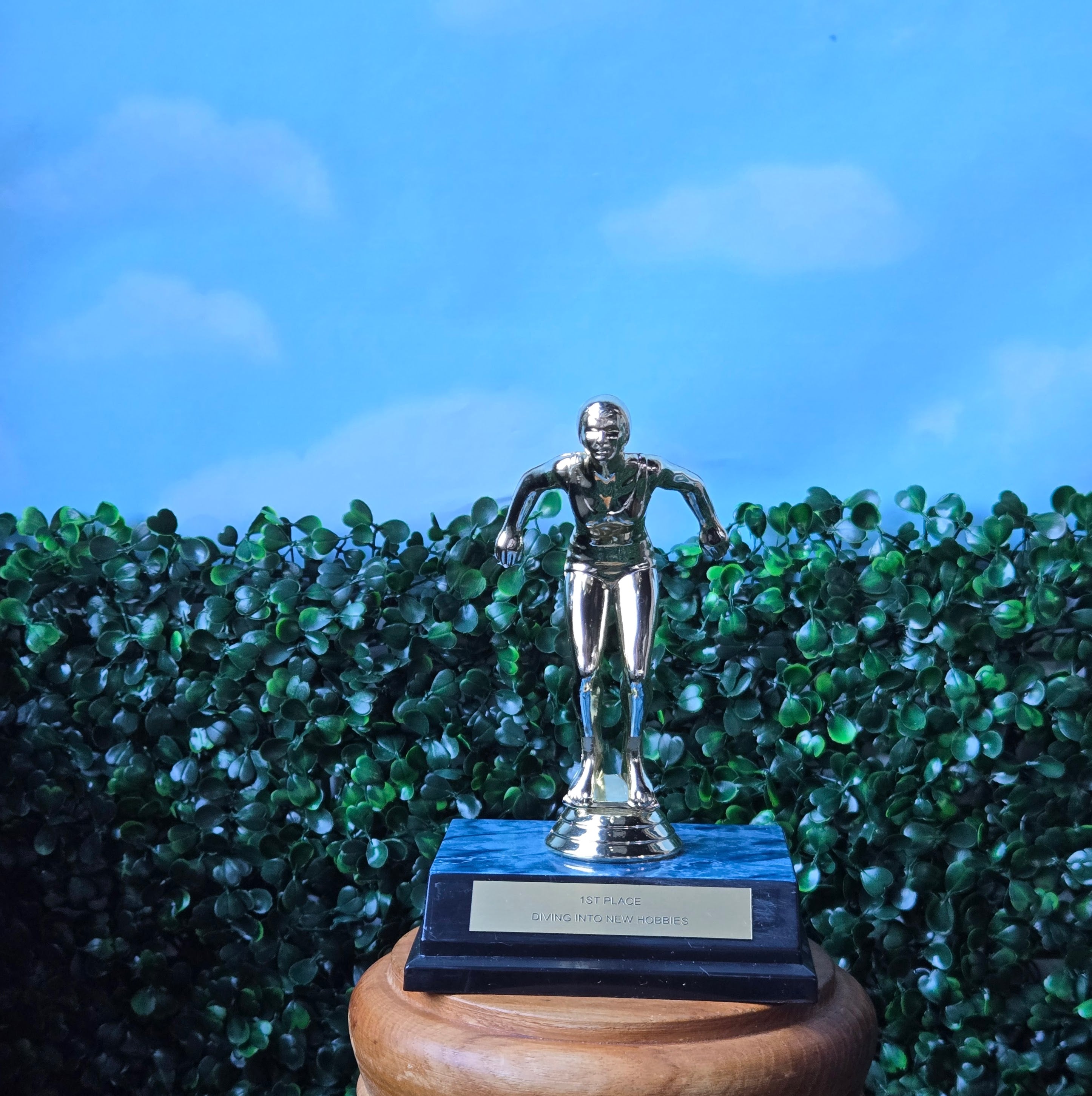 Upcycled Diving Trophy with a new plaque that reads '1st place - Diving into New Hobbies'