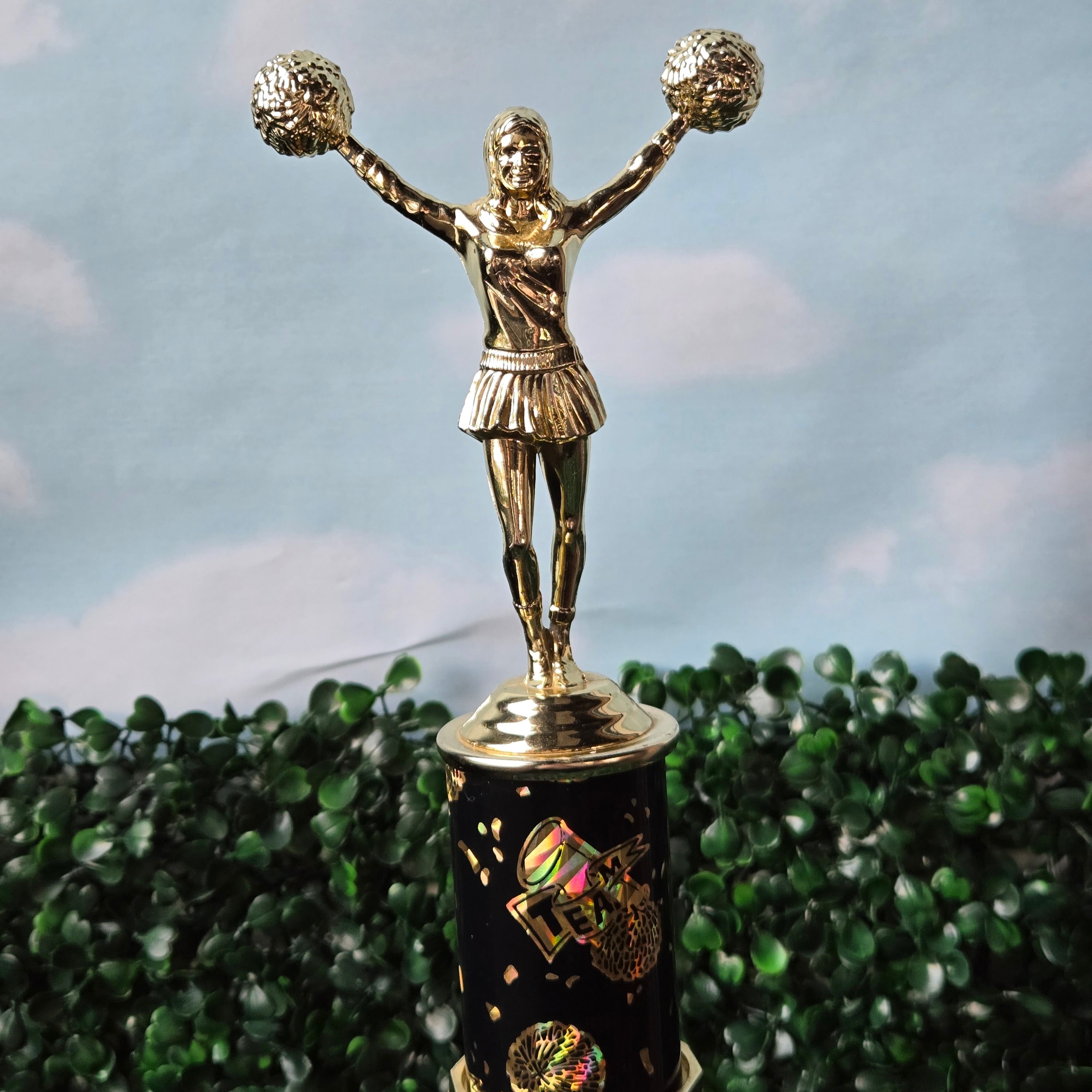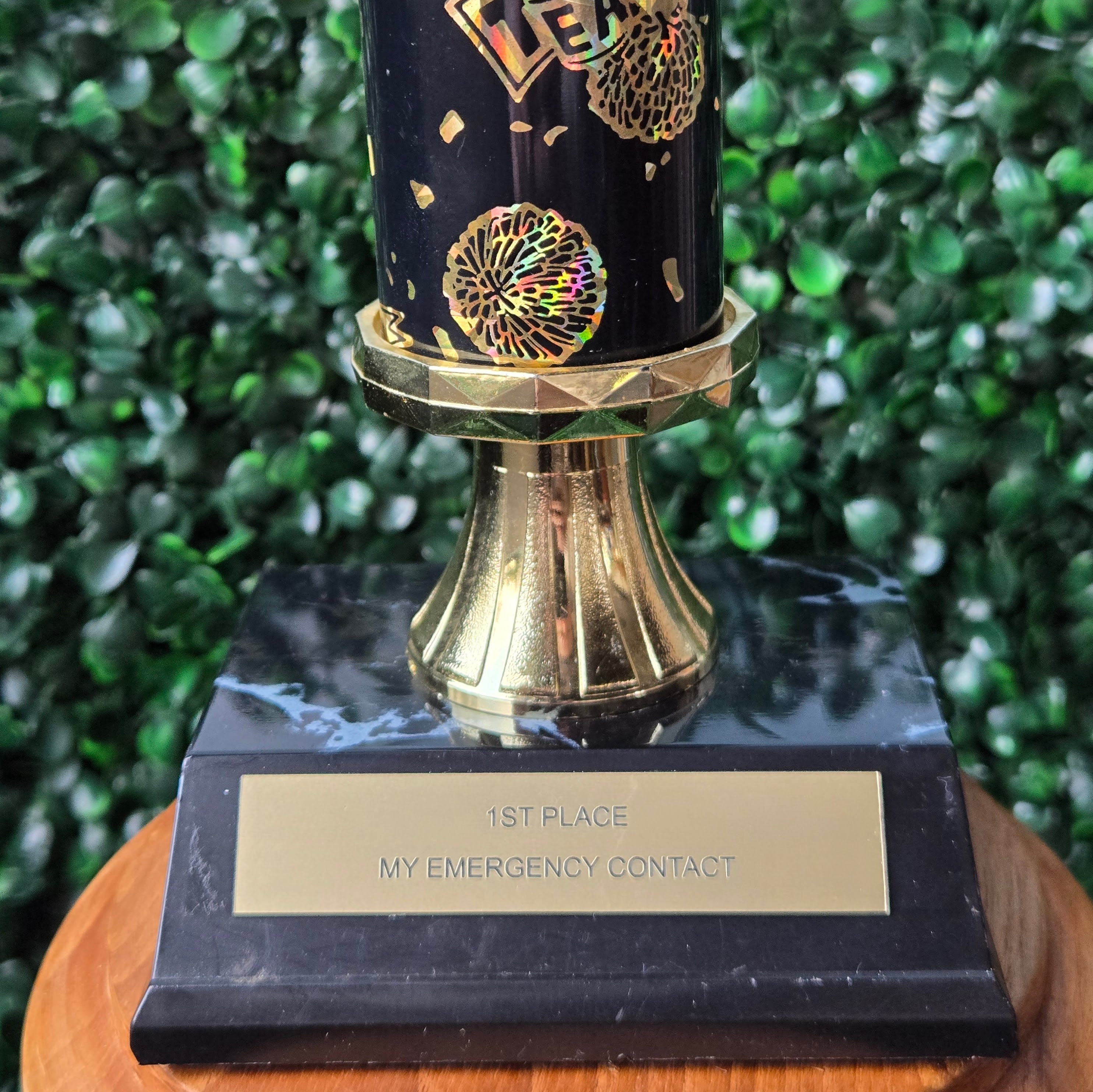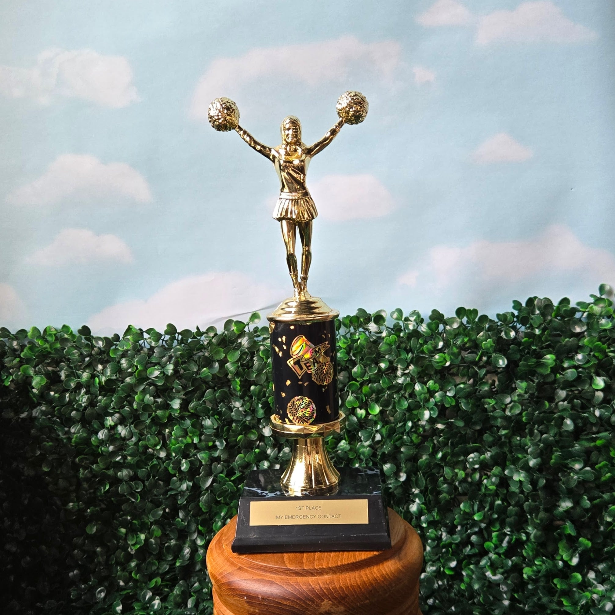 Upcycled Cheer Trophy with a new plaque that reads '1st place - My Emergency Contact'