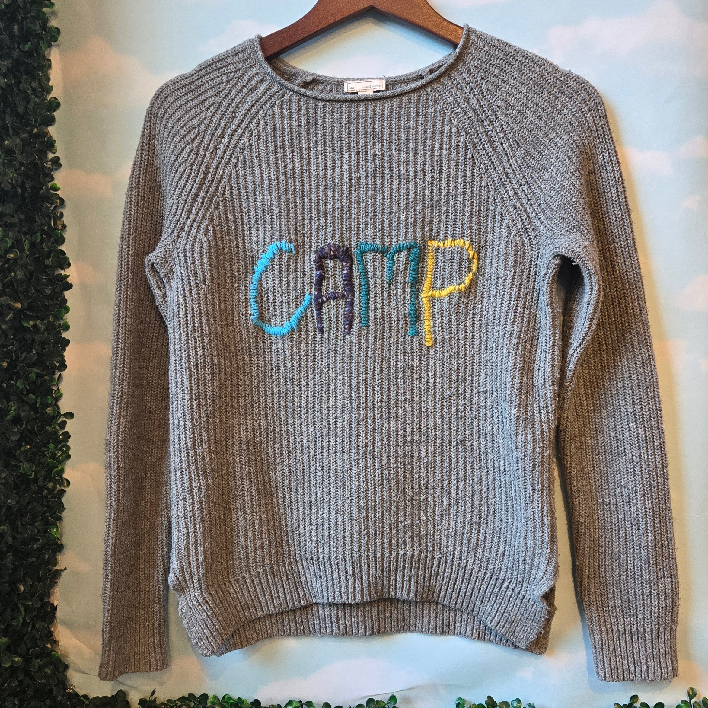 Camp * Embroidered Yarn Writing * Upcycled Sweater * Gray