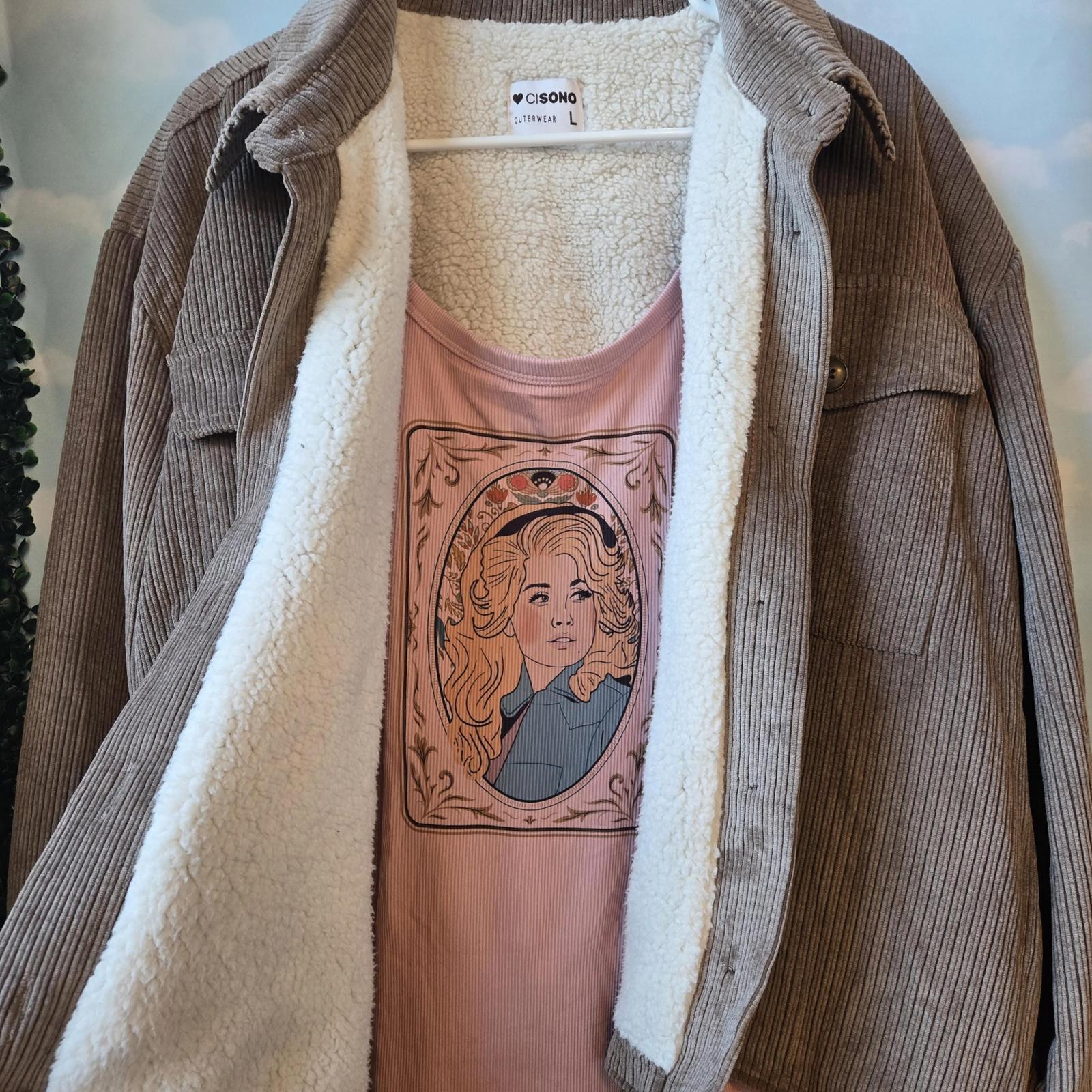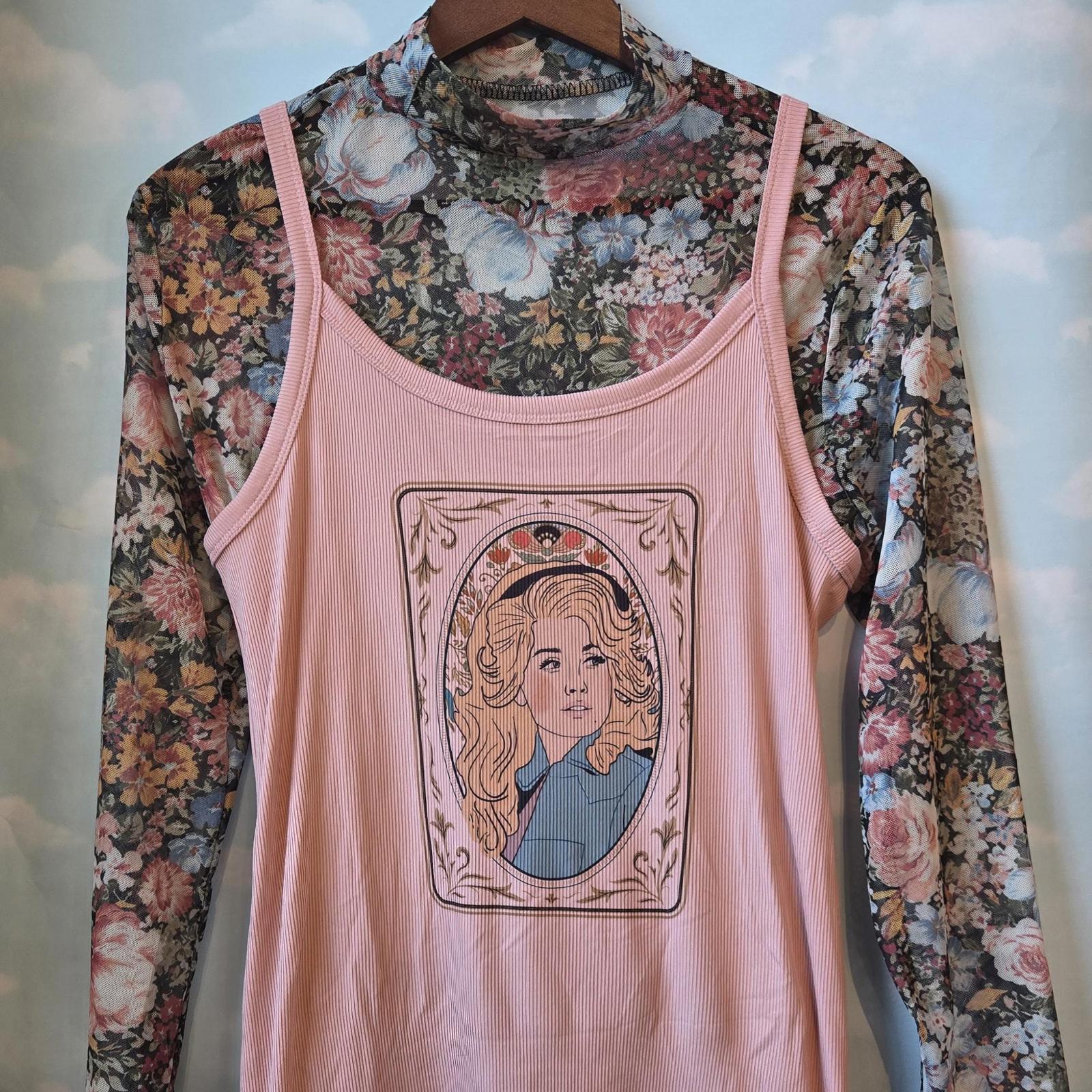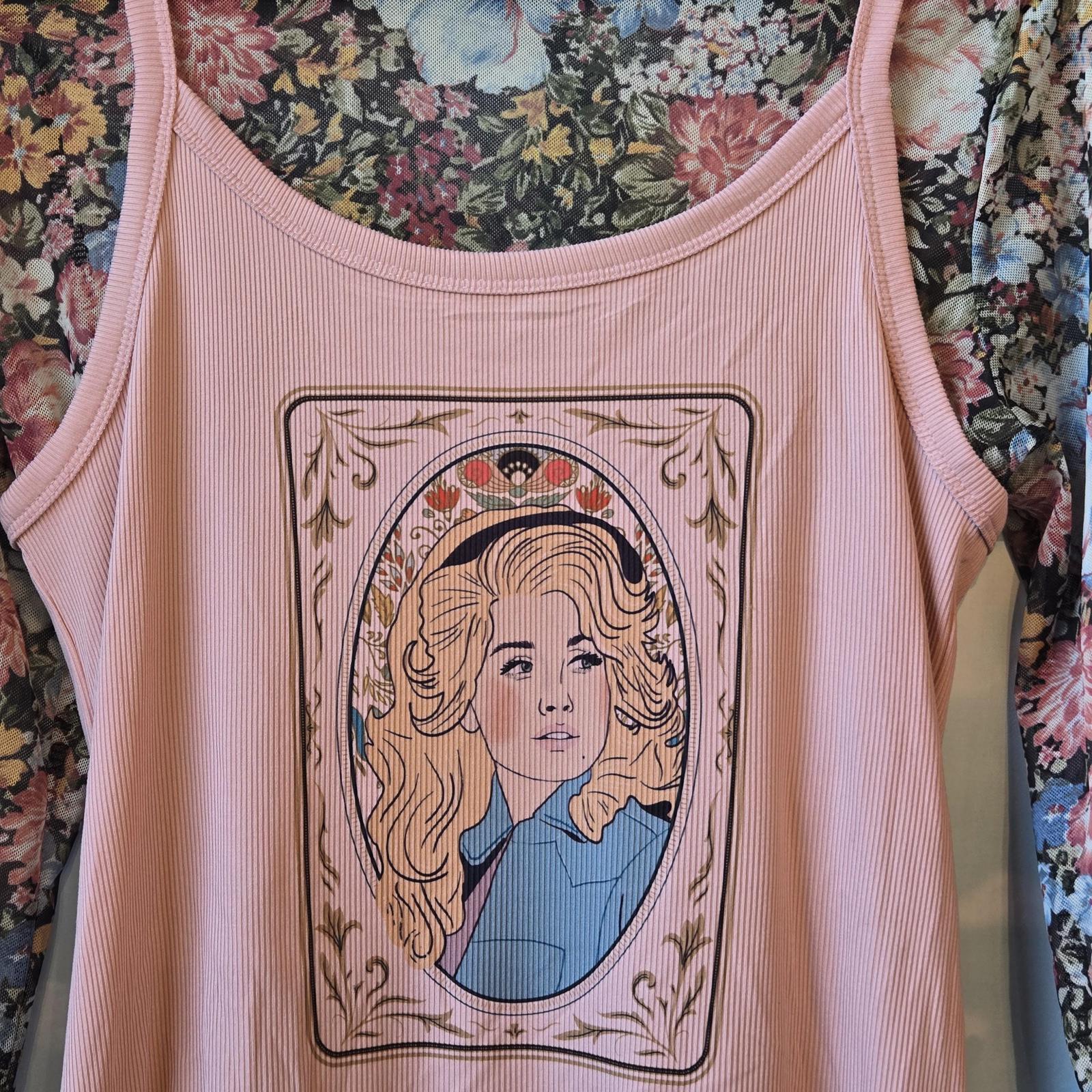 Handprinted ribbed tank, made with LOVE here in Asheville! Dusty pink ribbed spaghetti straped with Dolly graphic is the way to go.