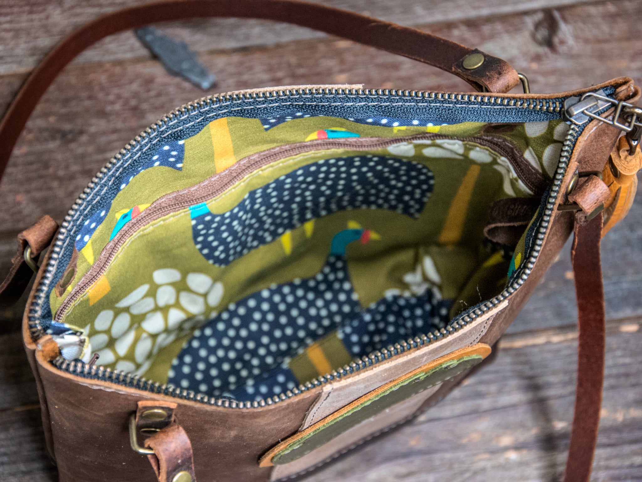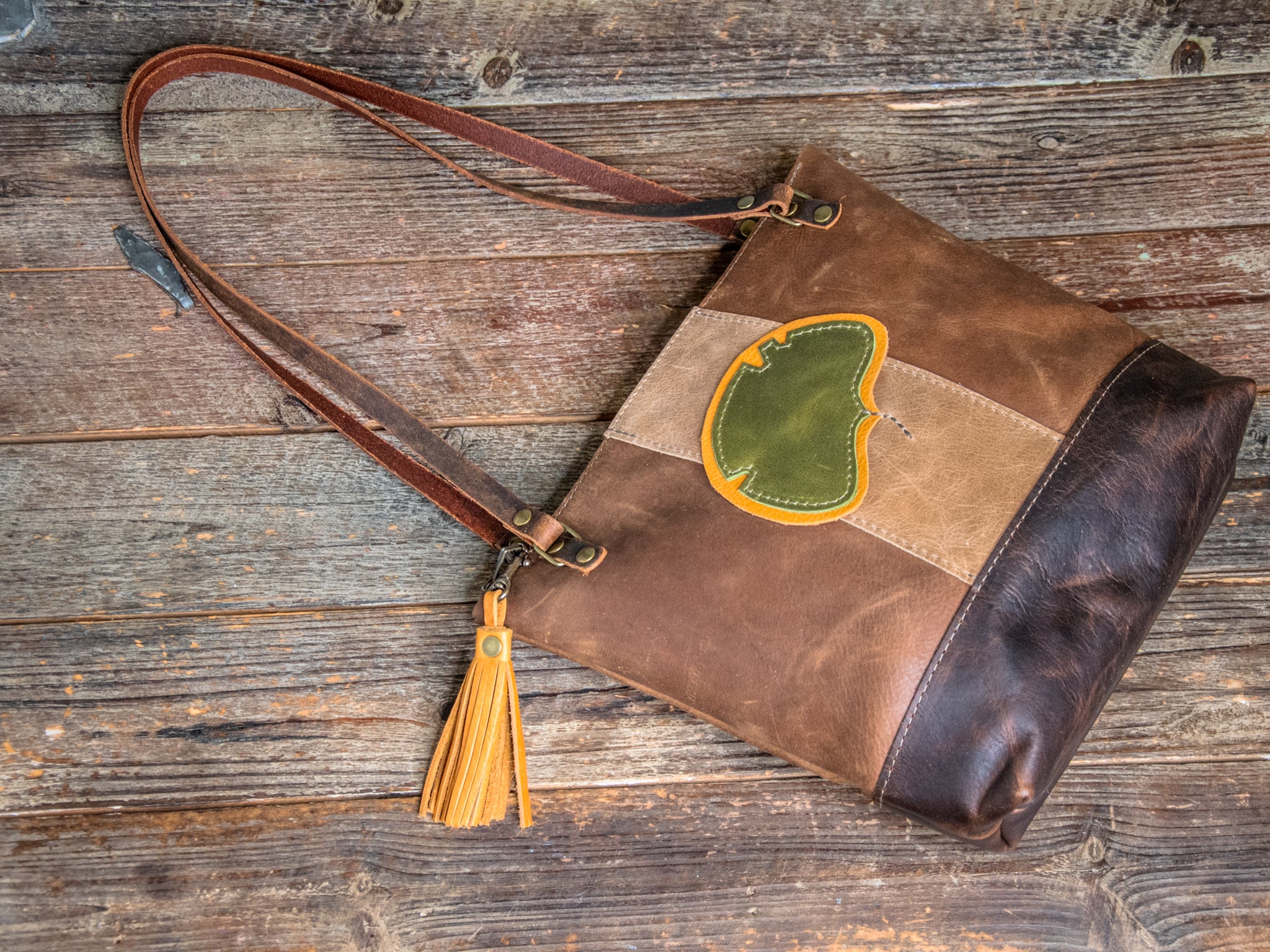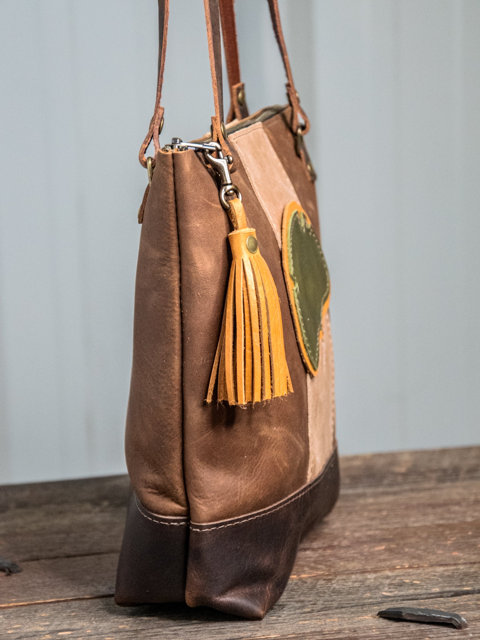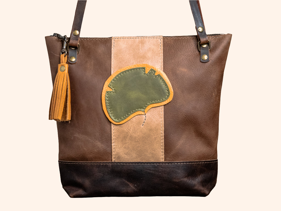 Leather Shoulder Zipper Bag * Brown and Green * Gingko Leaf