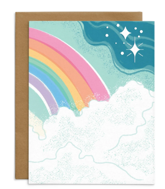 This playful card features a colorful rainbow and fluffy clouds with a hint of a starry nighttime sky. Perfect for sending a cheerful message to a friend or loved one anytime. Spread joy with each special handwritten note.
