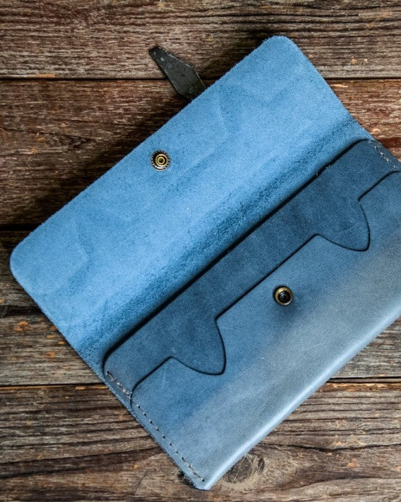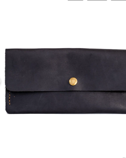 This minimalist wallet fits easily into your bag, and is made of gorgeous premium eco-friendly tanned leather. Our strong antique brass snaps keep everything together for you.