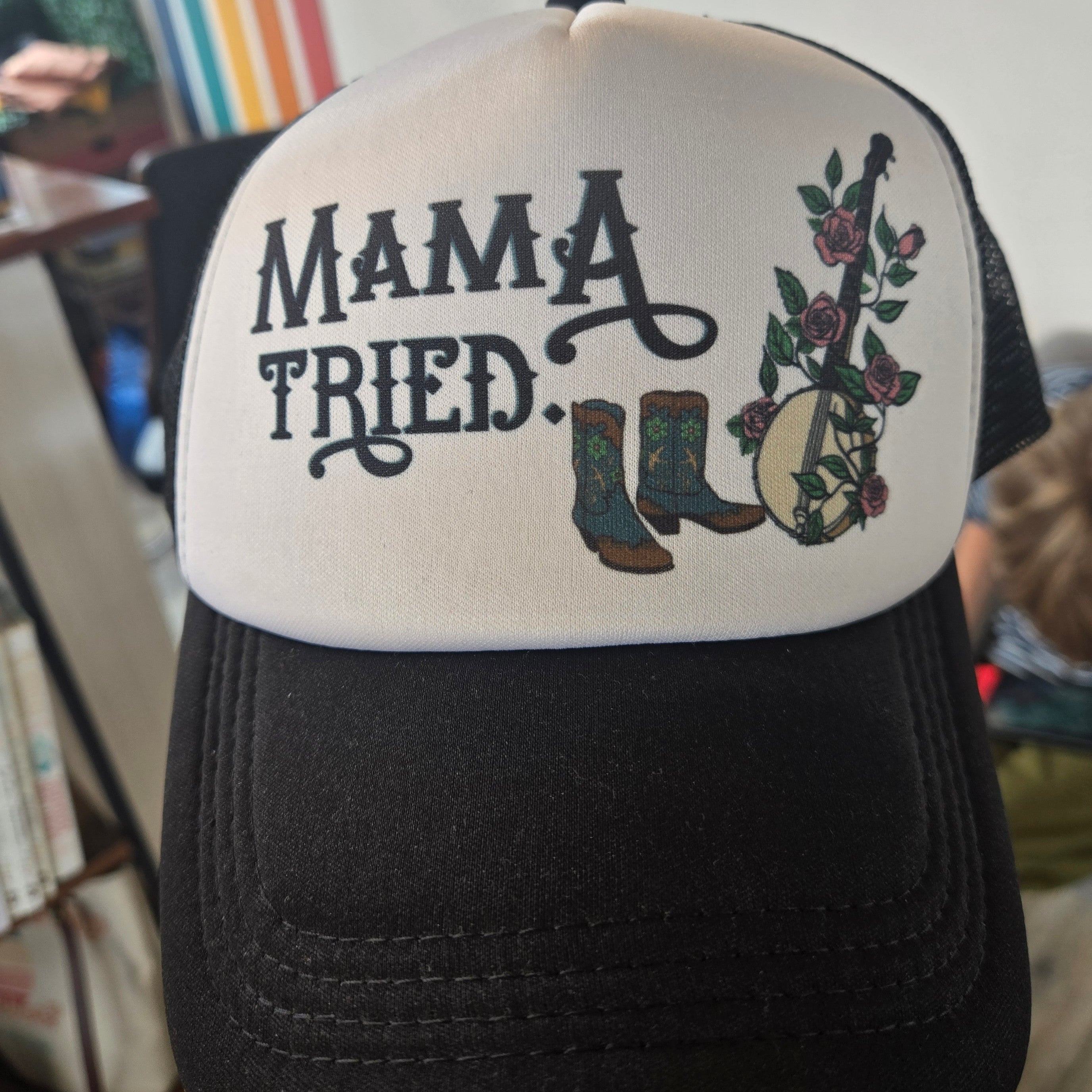 Mesh back, adjustable band. Simple style, so the saying can do all the talkin'.