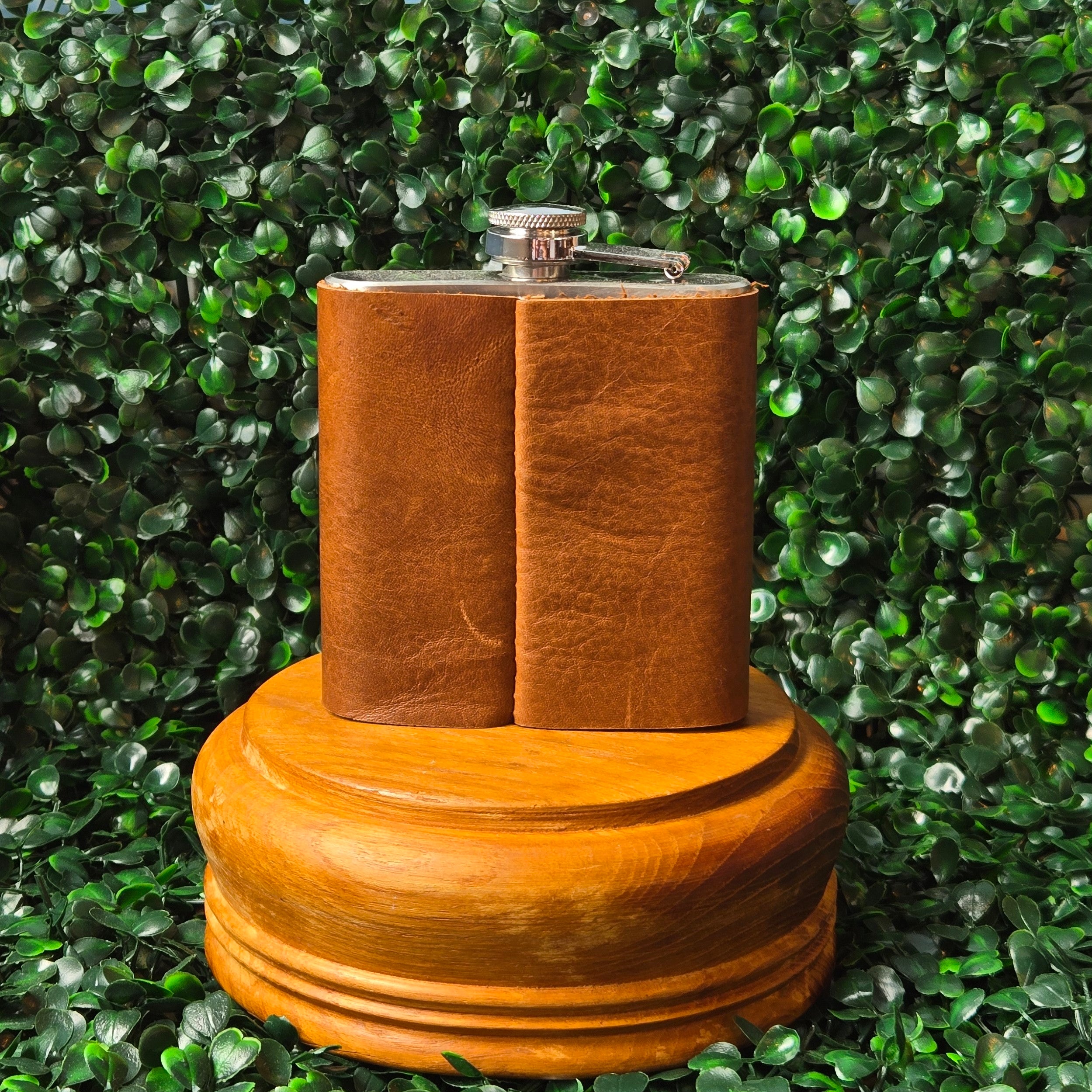 These beauties are stainless steel, 6 oz flasks, with a laser-etched leather sleeve!