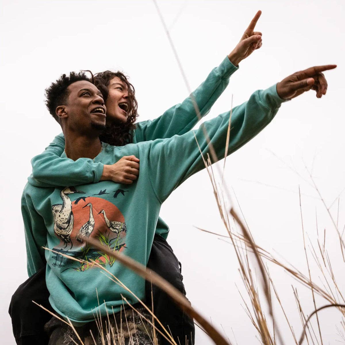 This striking sweatshirt features Sandhill Cranes in their element. Big, vocal, and loyal to their lifelong partners, these birds rely on wetlands and gather in the hundreds of thousands during their migration. Bird Collective raises awareness about native birds and helps fund projects to conserve them.