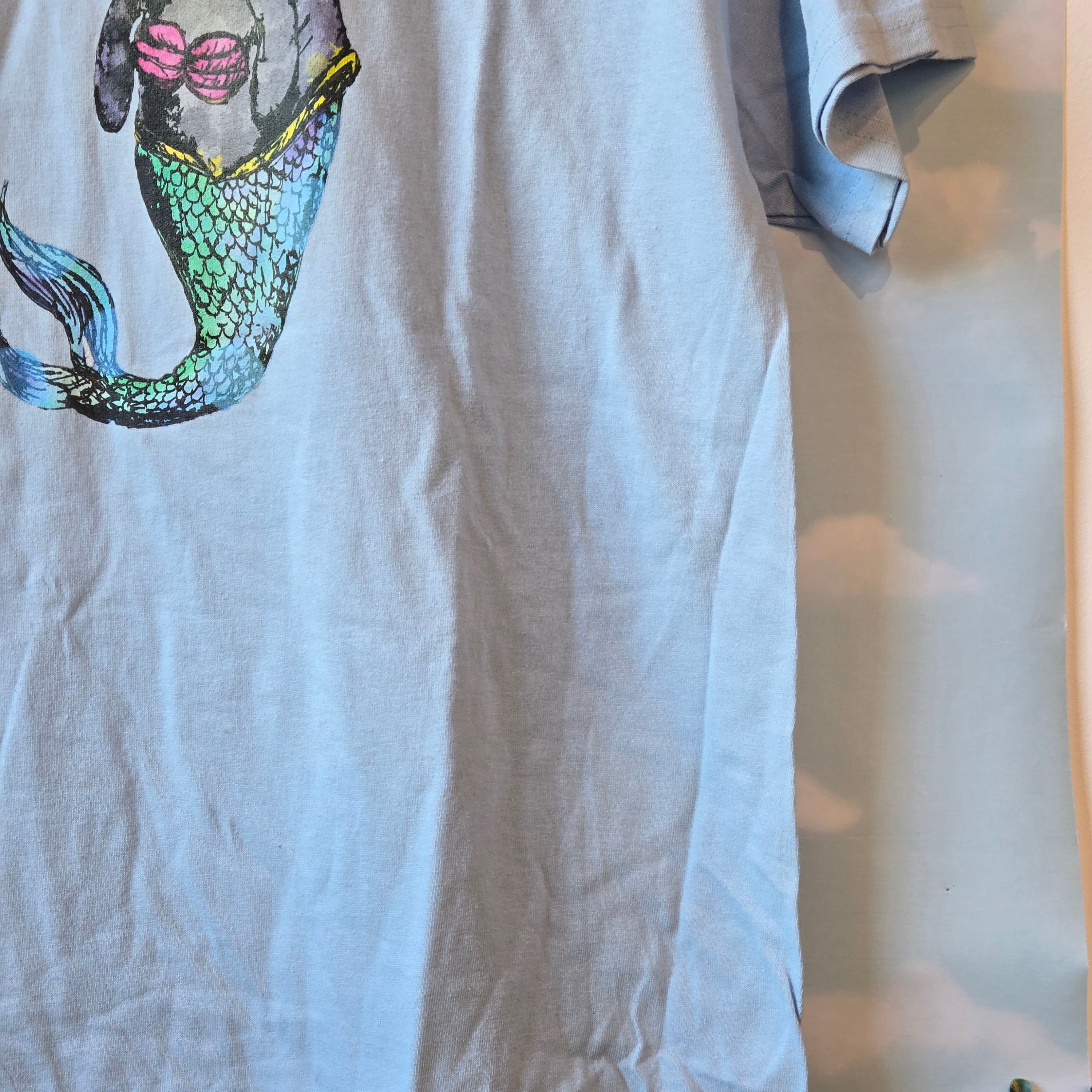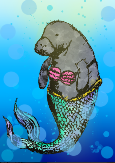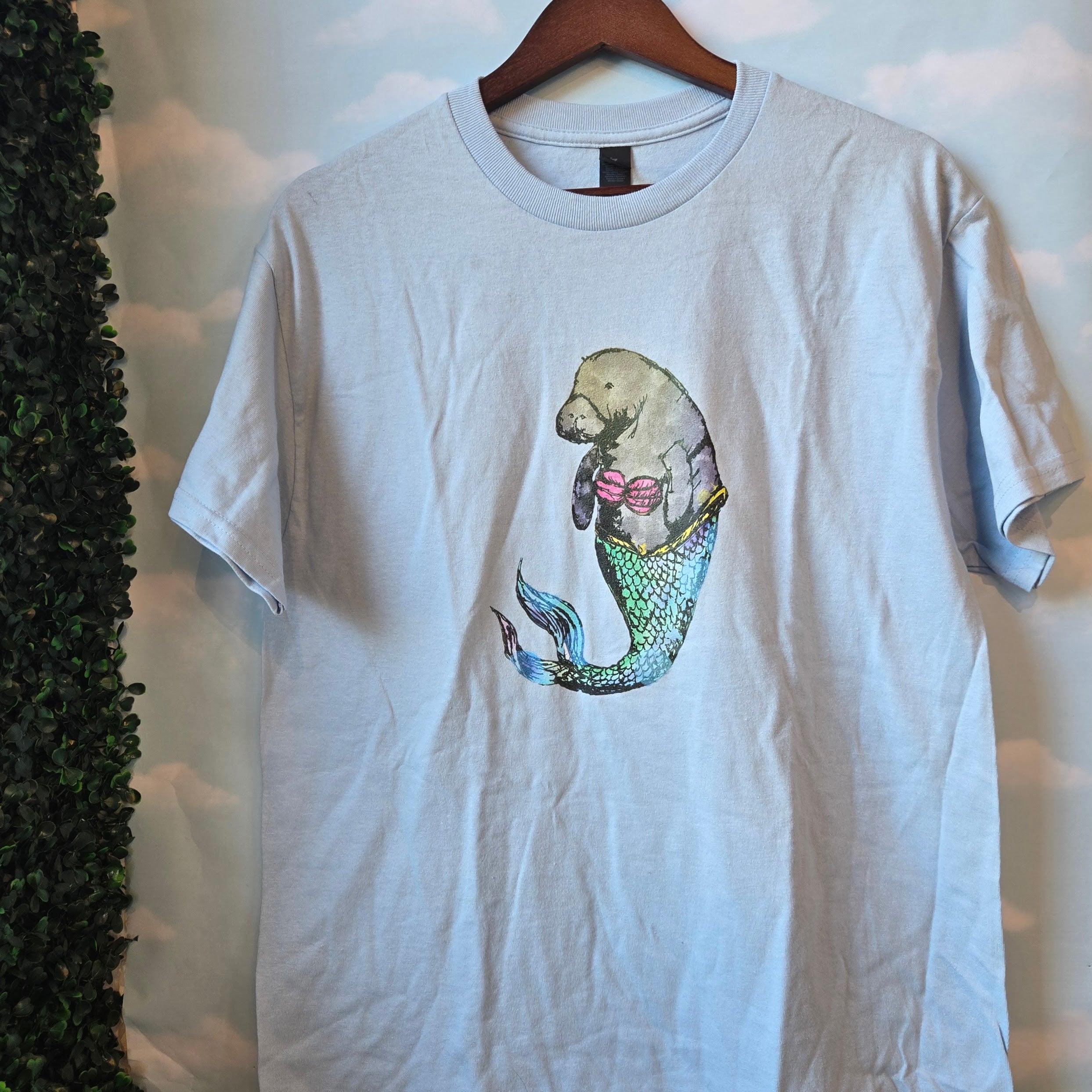 Mermatee features a manatee living its best life with a mermaid tail and seashell bra on a light blue tshirt