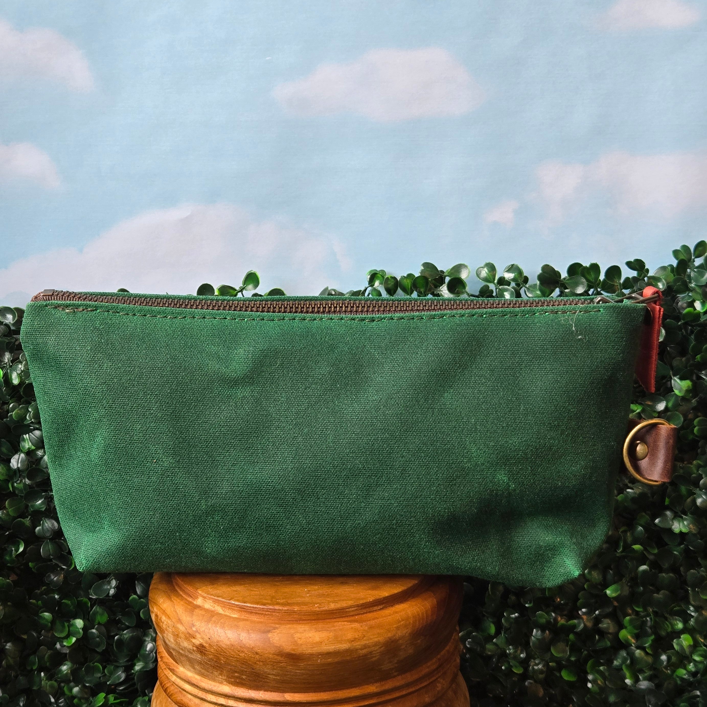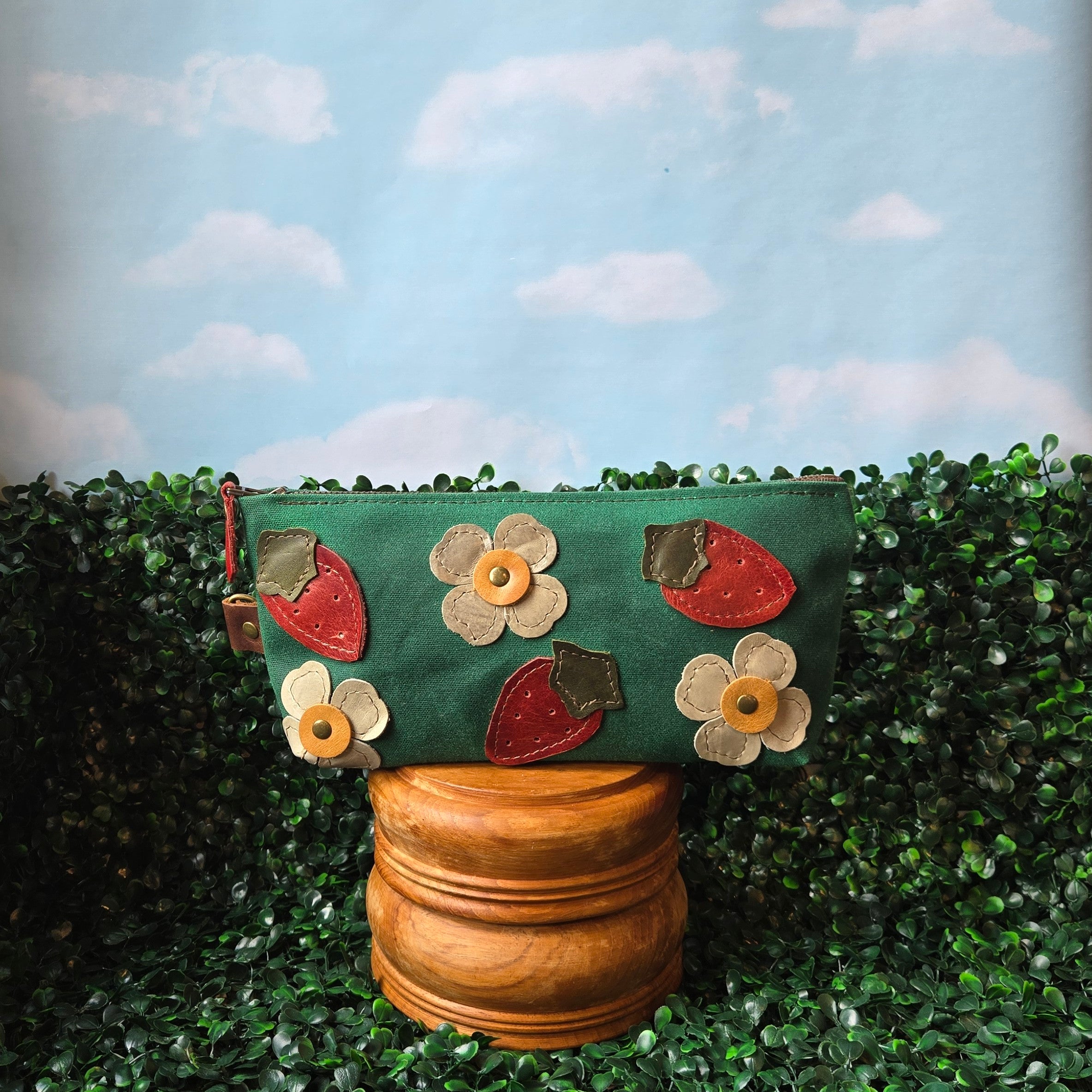 Waxed Canvas pouch with metal antique brass zipper and D ring. Green Waxed Canvas with leather Strawberries.